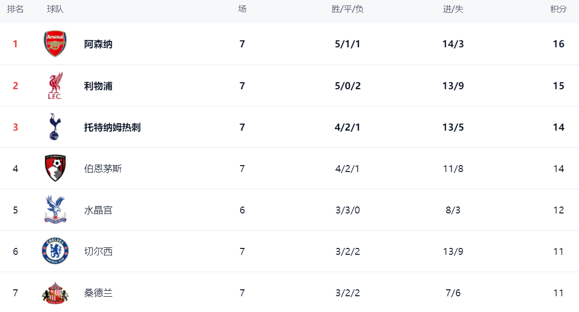 trong bảng xếp hạng, Arsenal, người đã thắng trò chơi, đứng đầu danh sách. Arsenal đã giành được 5 chiến thắng, 1 trận hòa và 1 trận thua, và ghi được 16 điểm. Thất bại của Liverpool trong vòng này vẫn là 15 điểm, xếp thứ hai. Tottenham đứng thứ ba với 14 điểm. Bournemouth cũng có 14 điểm, xếp thứ 4. Crystal Palace xếp thứ 5 với 12 điểm. Chelsea và Sunderland đều ghi được 11 điểm. Manchester City và Manchester United đều ghi được 10 điểm.