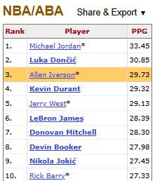 Iverson sự nghiệp thường xuyên mùa thường xuyên - 26,7 điểm mỗi trận, 914 trận trong lịch sử, bắt đầu từ 901 trận đấu, trung bình 26,7 điểm mỗi trận.
